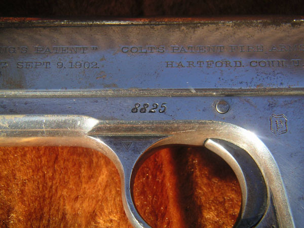 This gun has triangular front slide serrations and Browning's Patent marking on the left side of the slide.  These guns lacked the slide lock and lanyard loop as seen on the 1902 Military Model.