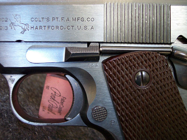 The initials of Major Charles S. Reed (C.S.R.), Officer in Charge of Outside Inspection, were stamped on all M1911A1 pistols manufactured in 1940, signifying government acceptance of the pistol.  His initials were stamped on the left side of the receiver below the slide stop in accordance with Ordnance drawings.  The initials C.S.R.  were also stamped on the top of the receiver near the disconnector hole to indicate provisional inspection, replacing the previous letter "R" within an oval.