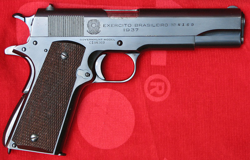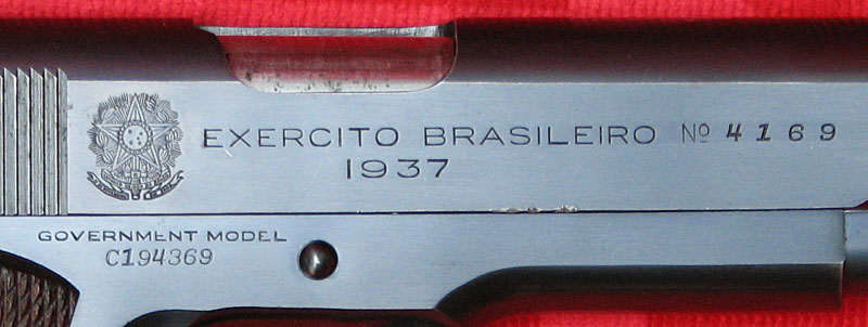 Colt Government Model 1911A1 Brazilian Contract serial number C194369, slide number "No 4169" - From 1937 through 1941, 14,500 pistols were purchased for the Brazilian Army. These pistols were in the serial number range from C188000 to C209000.  They were stamped on the right side of the slide to the left of the slide inscription with the Brazilian crest.  EXERCITO BRASILEIRO (which translated means "Brazilian Army") is also stamped on the right side of the slide above the date "1937."  Numbers on the slide range between 1 and 14,500.
