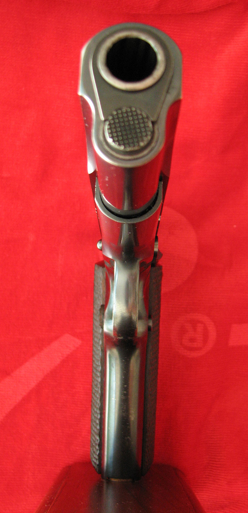 This pistol lacks the Swartz Safety, which despite being serial numbered in the range of Colt Government Models that shipped with this safety device, is normal for the Brazilian Contract pistols.  This pistol has a “G” next to the disconnect on the frame indicating it is a left over or reclaimed rejected military frame (without the heart shaped protrusions under the stocks). The serial number on the slide and frame match and the barrel has an “S” in front of the lugs. The magazine is a full blue pin connected with the COLT 45 AUTO marked base.
