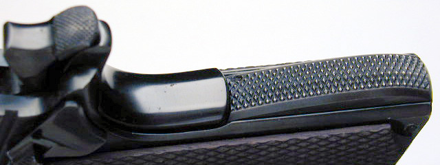 Close-up of the W.B. ordnance mark.  Pistol is fitted with a M1911 trigger.