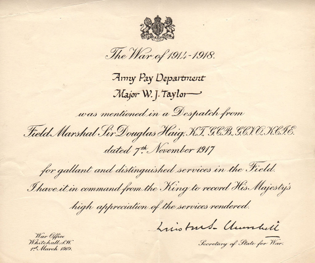 August 4, 1914. Major Taylor was mentioned in two dispatches