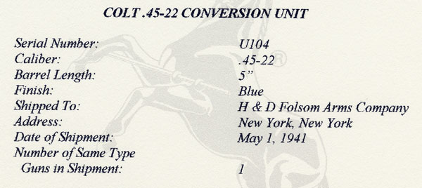 Colt .45 -.22 Conversion Unit serial number U104 - This unit was shipped from Colt's to Strevell, Peterson Hardware,  Pocatello, ID on February 29, 1941.  It was returned to Colt's on April 22, 1941 and shipped again to H.D. Folsom Sporting Goods, New York, NY on May 1, 1941.  Pictured with the set is the original instruction sheet.  This unit came cased with a blued Colt Service Model Ace.