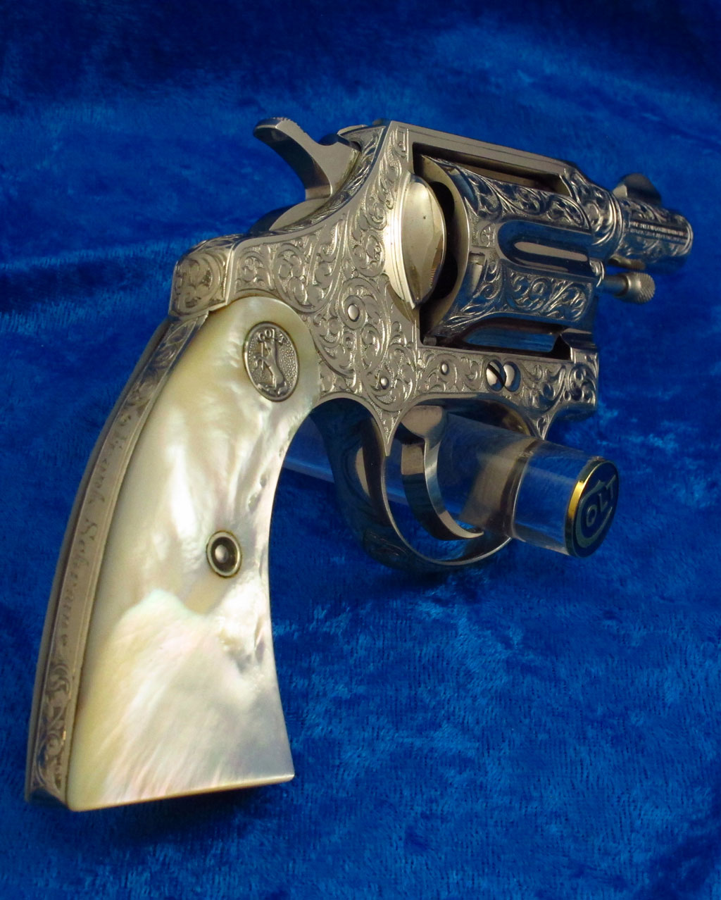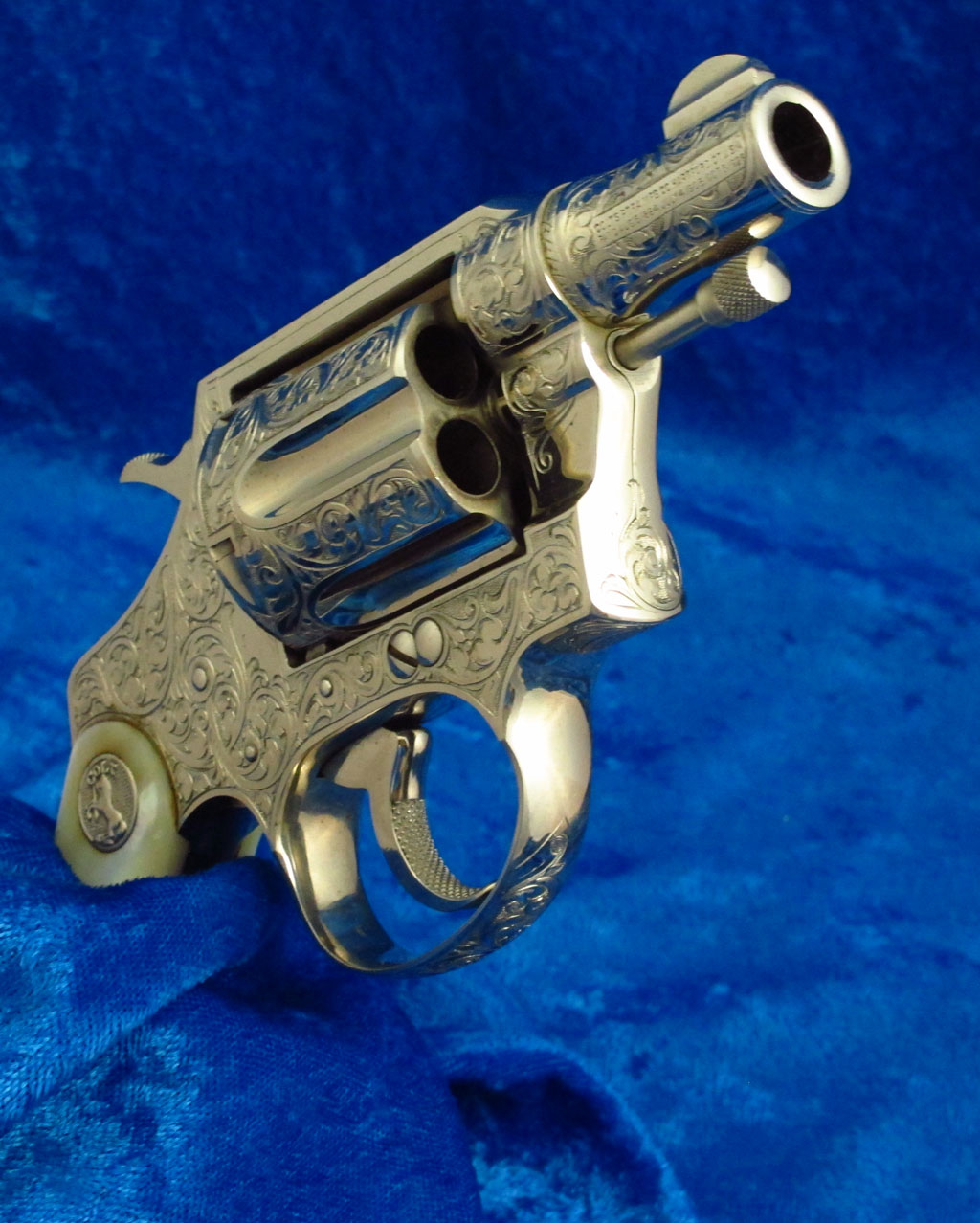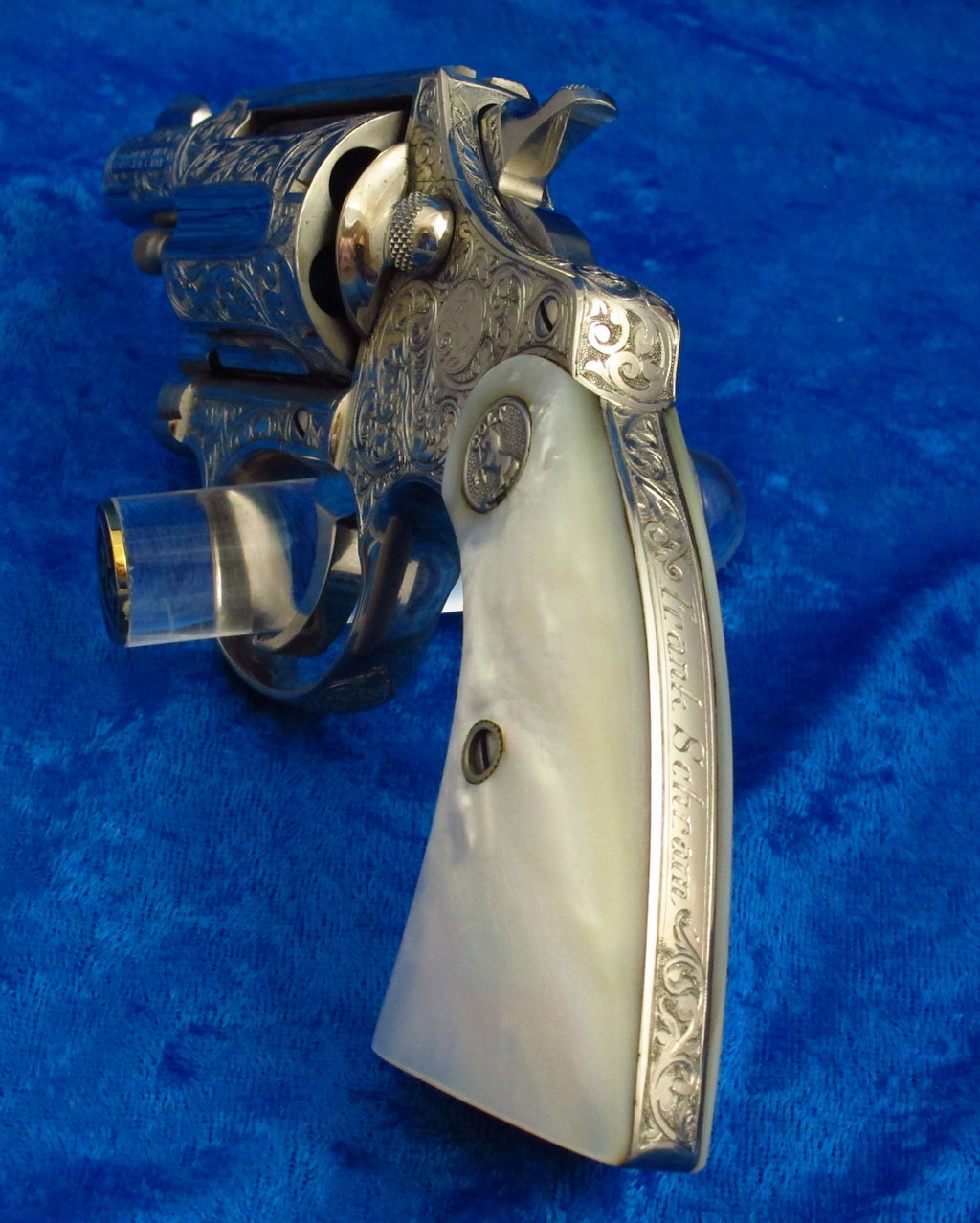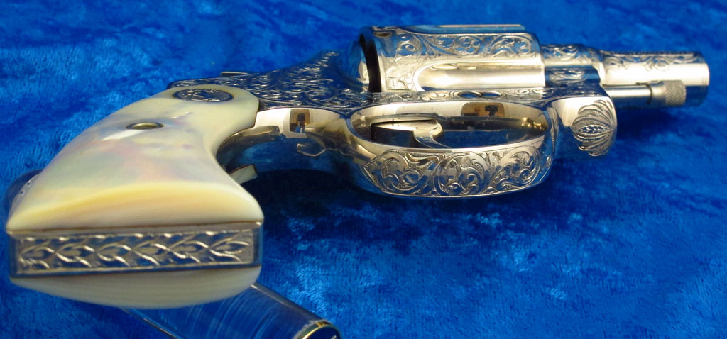 - Nickel finish, factory engraved and inscribed with medallion mother of pearl stocks. This revolver