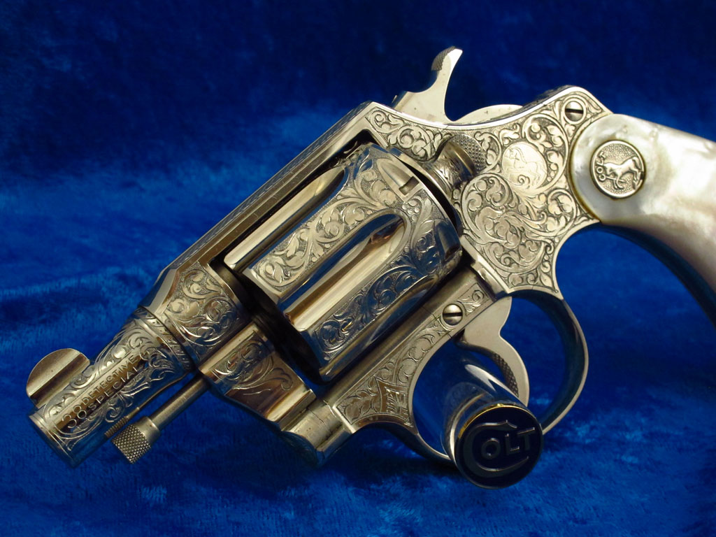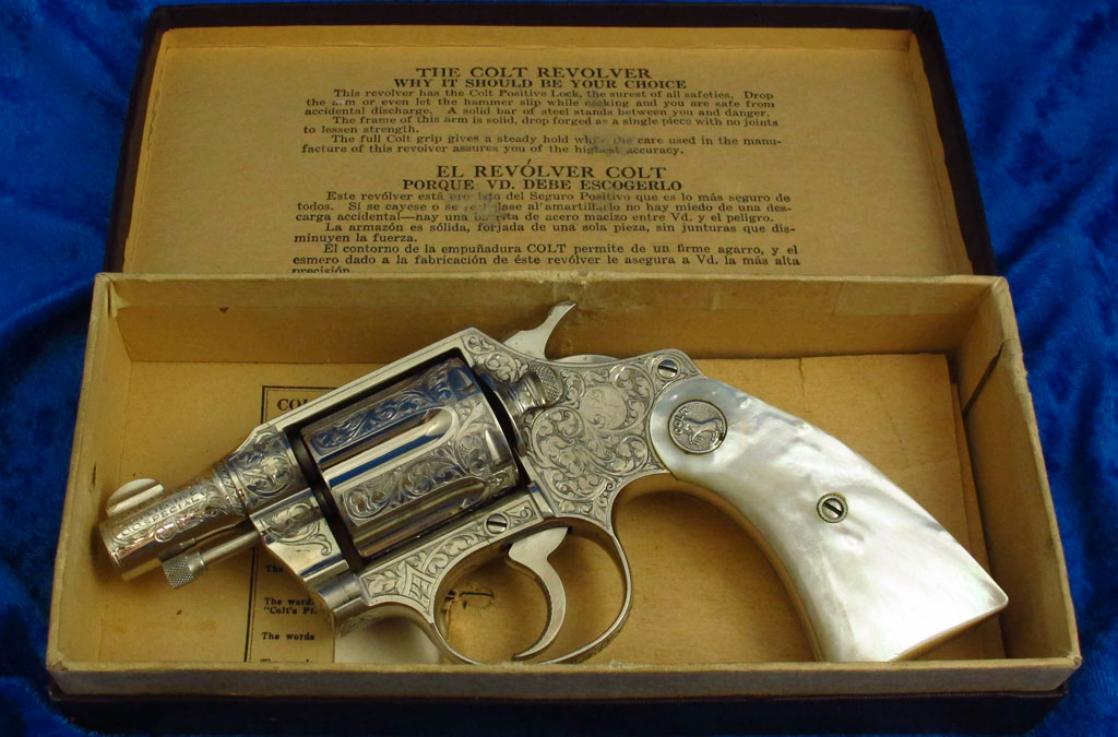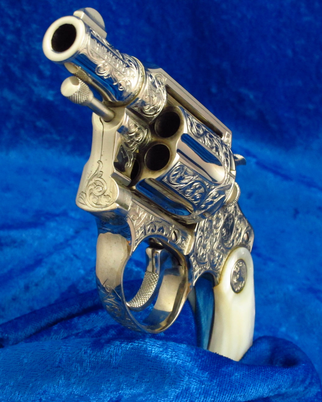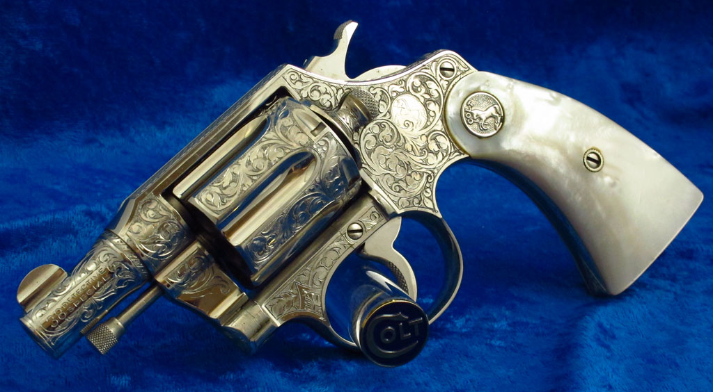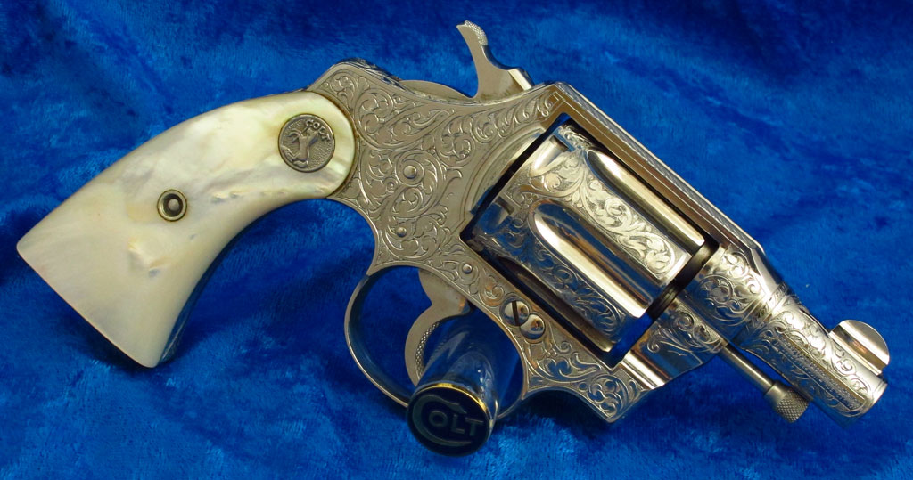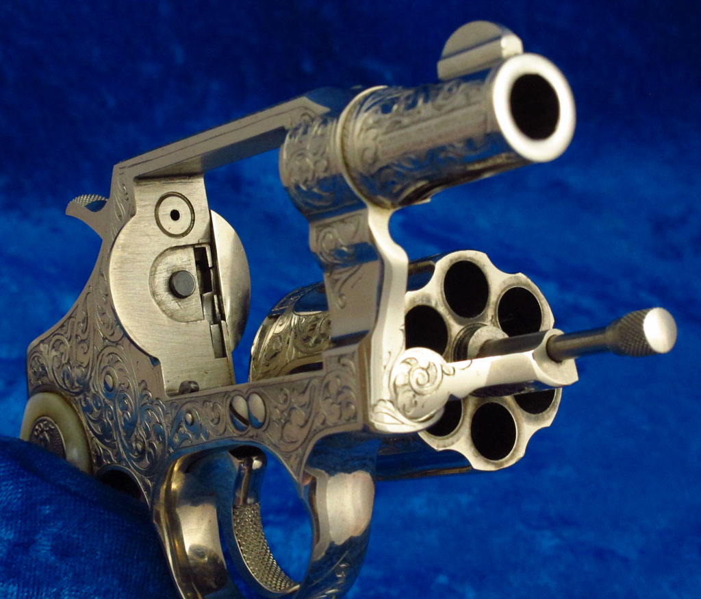 - Nickel finish, factory engraved and inscribed with medallion mother of pearl stocks. This revolver