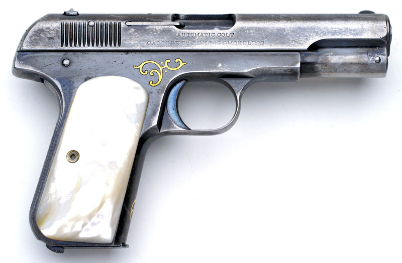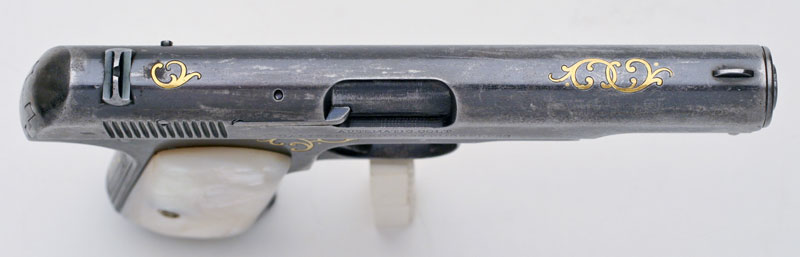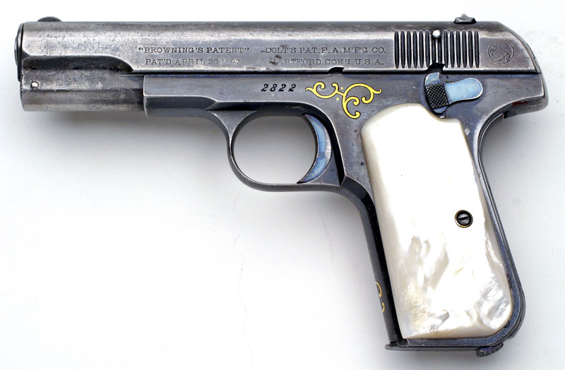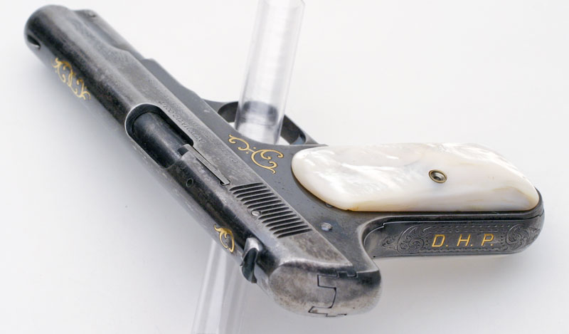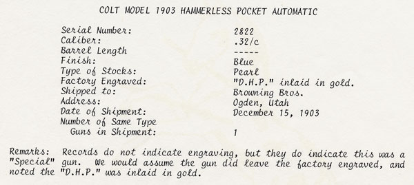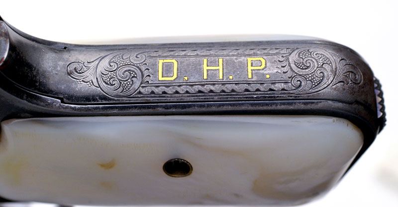November's Gun of the Month is the very first Model M with factory gold inlay. Additionally, this pistol is also the very first Model M shipped with mother-of-pearl grips. The pistol has six areas of gold inlay and is factory inscribed with the gold inlaid initials "D.H.P." and engraved on the grip safety. This work was performed by Colt master engraver Cuno Helfrict, who also did the first gold inlaid Model N (featured as the June 1999 Coltautos.com Gun of the Month.) The gun was shipped to Browning Brothers in Ogden, Utah in December 15, 1903 - just a few months into production.