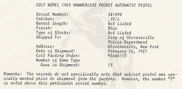 Factory letter for GPD marked Colt 1903 Pocket Hammerless .32 ACP indicates that the gun was one of 13 shipped to the City of Gloversville Police Department, Gloversville, New York on February 26, 1921. Processed on Colt Factory Order number 2604/13. An original photograph with names of the members of GPD from 1949