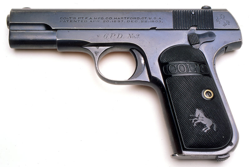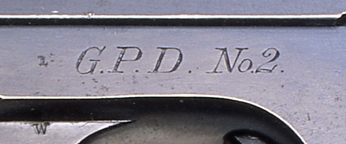 Model M .32 serial number 381490 with factory inscription "G.P.D. No. 2" engraved (not roll marked) on the left side of the frame where the serial number is typically located. This was one of 13 guns shipped to the Gloversville, NY Police Department in the 1920s. It is interesting to note that in order to accommodate the location of the inscription, the serial number was factory engraved on the right side of the frame.