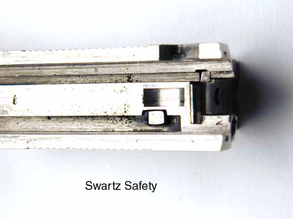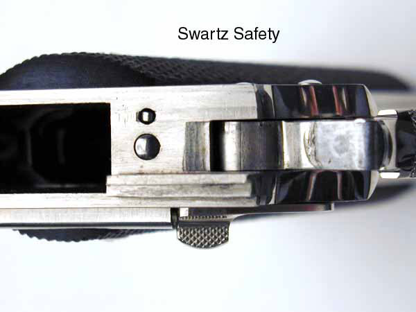Colt National Match Serial Number C189556 with adjustable sights, Swartz safety, factory nickel finish and checkered walnut grips.  Colt factory letter indicates pistol shipped with nickel finish on September 10, 1938.  Letter also indicates that this pistol was furnished with a new safety device and adjustable rear sight on Colt Factory Order Number # 8085.  Shipped to Wolf & Klar Wholesale Sporting Goods, Inc, Ft. Worth, TX as a single gun shipment.  The Swartz safety is a device that blocks the firing pin when the grip safety is not engaged.