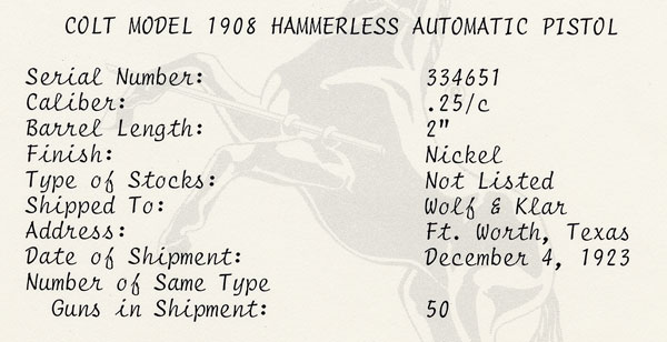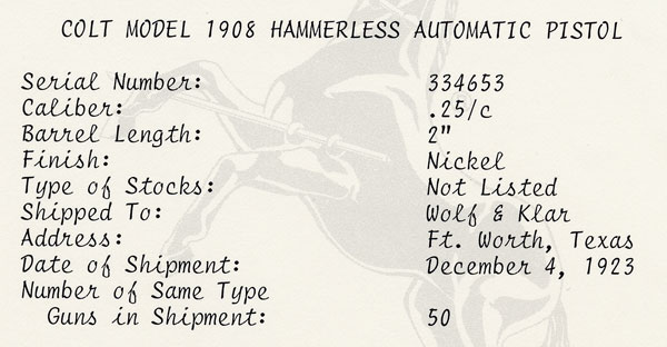 Colt Model 1908 Vest Pocket .25 ACP factory letter for serial number 334653.