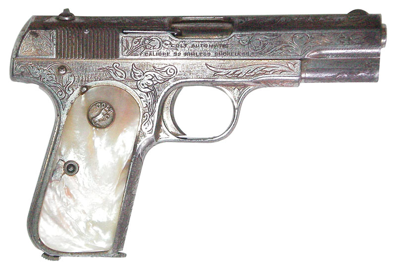 1903 Colt Pocket Hammerless .32 ACP Serial Number 296951- A rare factory master engraved and factory gold plated Model M. This pistol was one of 12 pistols engraved by William Gough shipped October 27, 1919 overseas.  There were 27 factory gold plated .32s, most of which were exported to foreign countries.