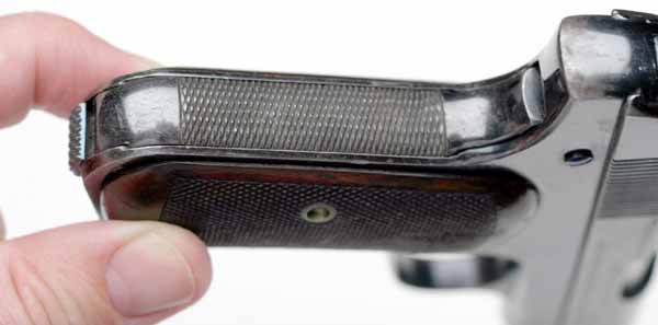 Colt Model 1903 Pocket Hammerless Type I serial number 49764 - with factory checkered grip safety and deluxe checkered walnut grips. Pistol has high polish finish and fire blued small parts. Gun also has British Proof marks. Colt Factory Letter indicates that this pistol was shipped to Colt's Patent Fire Arms Manufacturing Company, London Agency, London, England on November 27, 1906. There were 50 guns in the shipment.