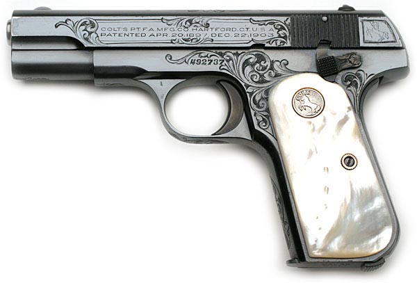 Colt Model 1903 Pocket Hammerless serial number 492737 Exhibition Piece - Factory "A" engraved Model M in .32 caliber. A well traveled pistol which was a factory display piece shipped on "Loan Account" to the following destinations: Wolf & Klar, Fort Worth, TX (6/5/28), Colt's Patent Fire Arms Mfg. Co., Camp Perry, Camp Perry, OH (8/14/29), Shreve & Barber, San Francisco, CA (3/11/31), Murta-Appleton & Co., Philadelphia, PA (2/19/32), Edwards & Walker Co., Portland, ME (3/10/32), Von Lengerke & Antoine, Chicago, IL (4/14/32) and sold to Von Lengerke & Antoine (8/15/34).