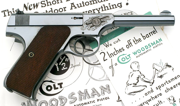 Colt Woodsman Sport .22 LR serial number 118653 - Right side view with original Colt factory advertisement and brochure announcing the New woodsman Sport with 4 1/2" barrel.
