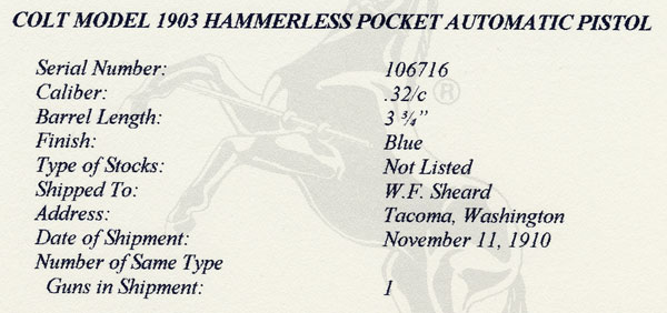 Pistol was a single gun shipment to firearms dealer W.F. Sheard, Tacoma, Washington on November 11, 1910.