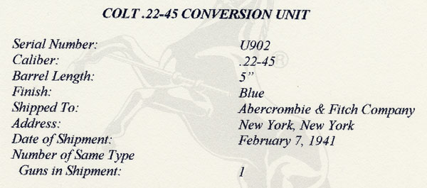 Pre-WWII (ca. 1941) Numbered Conversion Unit complete with original box, instructions and all accessories.  Two tone magazine with "Service Model" designation on the floor plate.  Floating chamber and barrel are numbered to the slide.  Factory letter indicates that this was a single unit shipment to Abercrombie & Fitch Company, New York, New York on February 7, 1941.