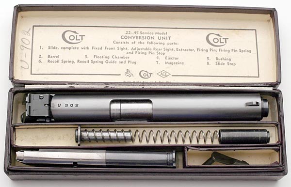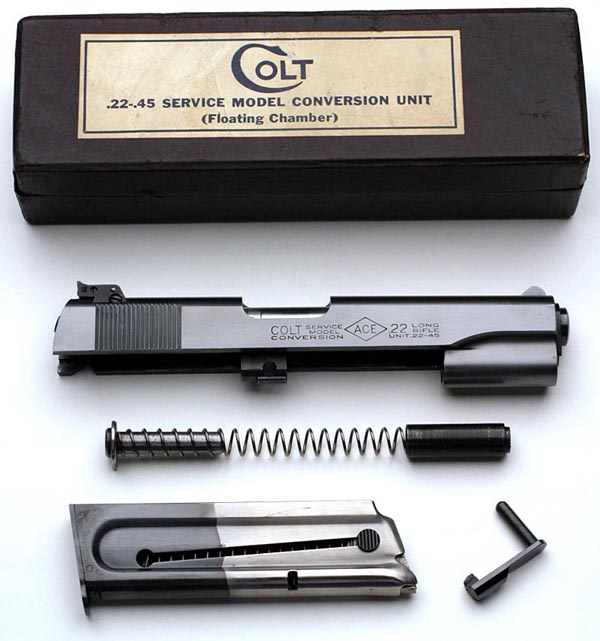 Conversion Unit with original box showing slide, guide, recoil spring, plug, slide stop and two tone Service Model Ace magazine.  Barrel, floating chamber and ejector are inside the slide.