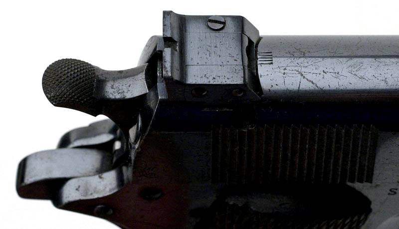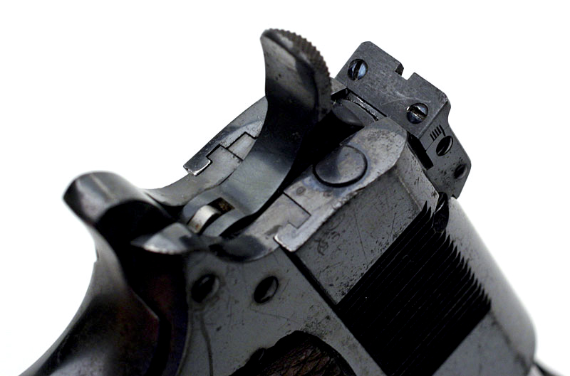 Colt Service Model Ace Serial Number SM355 - rear view of early Stevens sight.  Note the use of fire blued screws on this early sight.