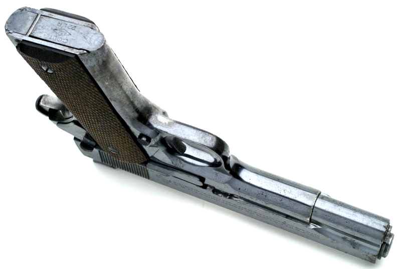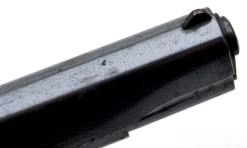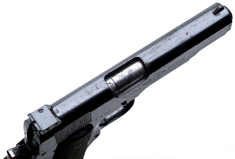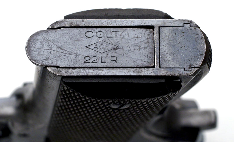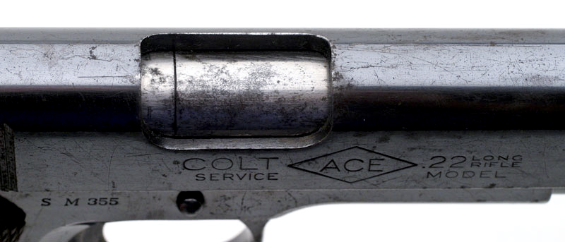 Colt Service Model Ace Serial Number SM355 - ejection port showing floating chamber and early style slide markings.