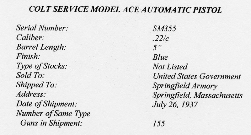 Colt Service Model Ace Serial Number SM355 - Early variation with earliest style slide markings.  Pistol was shipped to the U.S. Government, Springfield Armory, July 26, 1937 in a 155 gun shipment.