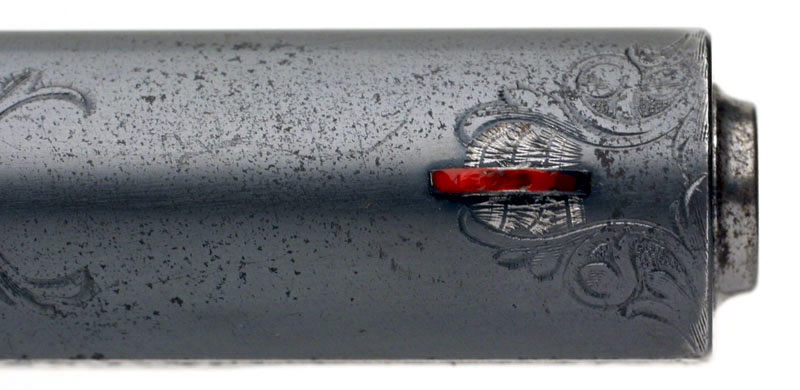 Close-up of the right side of the slide. Notice how the area around the front sight and the front sight is engraved. The front site is factory -- the red paint on the front sight was applied by a previous owner.