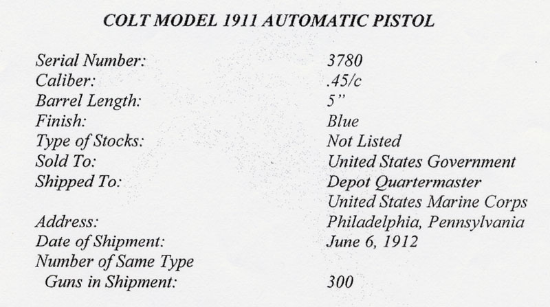 Colt Model 1911 US Marine Corps Contract - .45 cal. S/N 3780, sold to the United States Government, shipped to Depot Quartermaster, United States Marine Corp, 1100 Broad Street, Philadelphia, PA on June 6, 1912 in a shipment of 300 pistols.