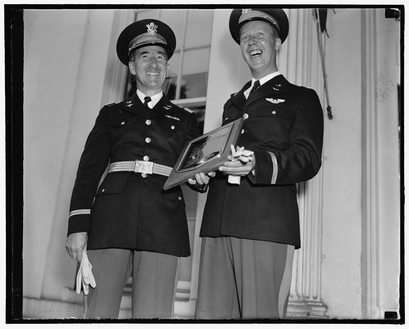 SI Neg. 2000-3735. Date: na...Official USAF caption: Presentation of Collier Trophy for 1937 to U.S. Army Air Corps. President F. D. Roosevelt seated at desk, Gen. H. H. Arnold, accepting. Left to right, front row: Brig. Gen. Henry H. Arnold, Major Carl F. Grune, Dr. John E. Younger, Lt. Col. Oliver P. Echols. Extreme right - back row: Capt. Alfred H. Johnson. [Photo taken 16 September 1938.]..Credit: Unknown. (Smithsonian Institution)