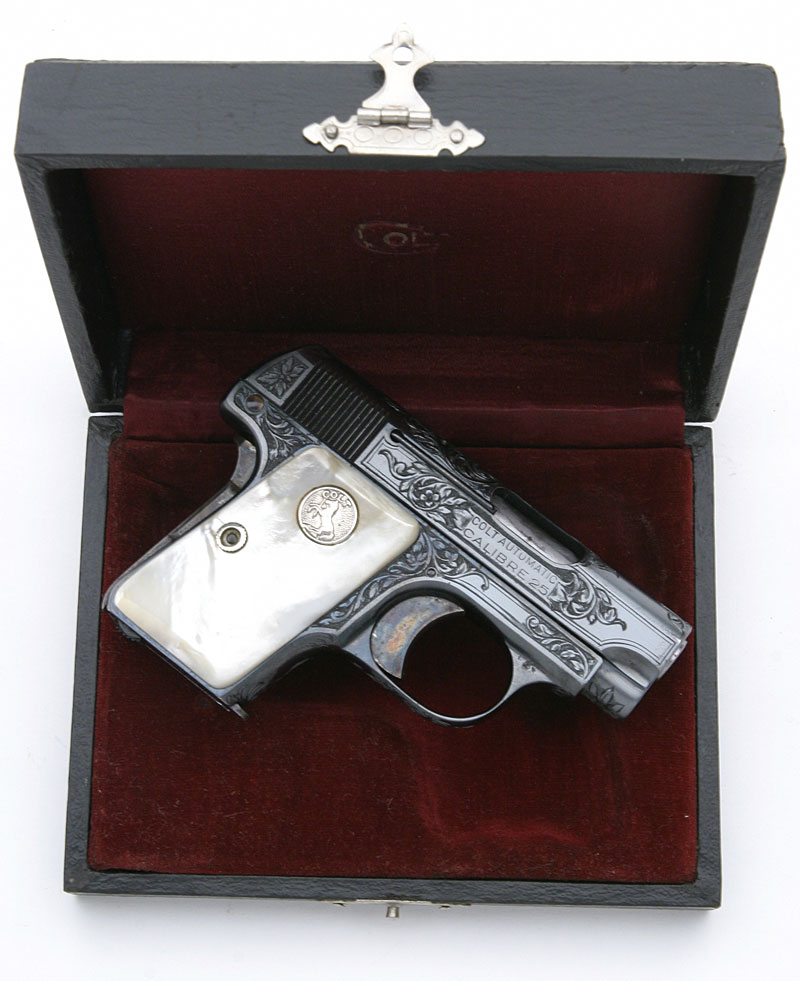 Factory Engraved Colt 1908 Vest Pocket .25 ACP serial number 377711 - pictured in maroon lined factory presentation case (right side). |