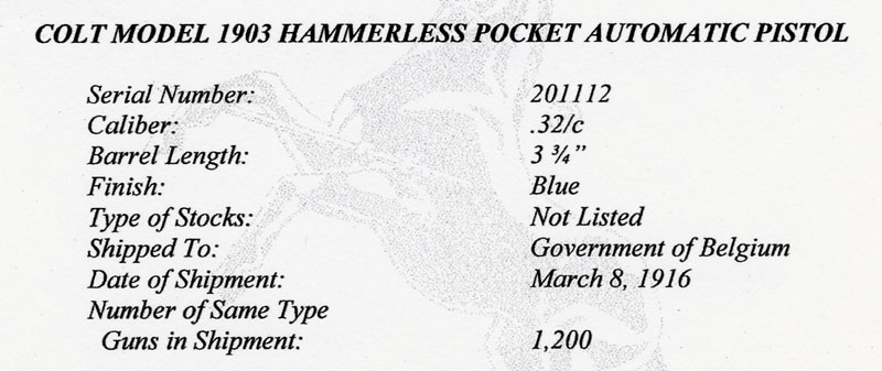 Pistol was one of 1,200 shipped to the Government of Belgium on March 8, 1916.