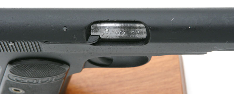 Colt 1903 .32 ACP serial number 201112 - right side close-up showing British proof marks on slide (above extractor), on frame (above trigger) and on the barrel (visible through the ejection port.)