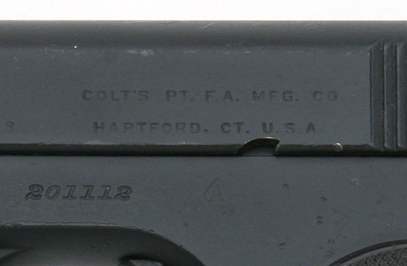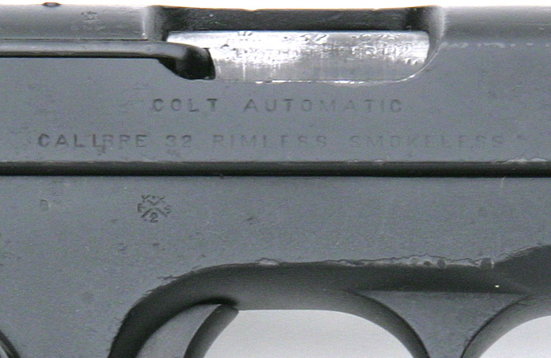 Colt 1903 .32 ACP serial number 201112 - close-up showing "A" in a diamond.  Most Belgian WWI contract pistols as well as contract overrun pistols have this marking.