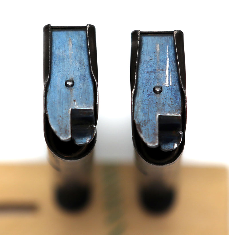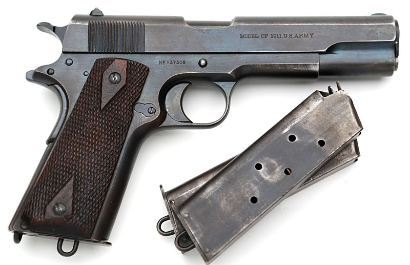 Colt Model of 1911 serial number 137309 (right side) pictured with two Type I magazines.