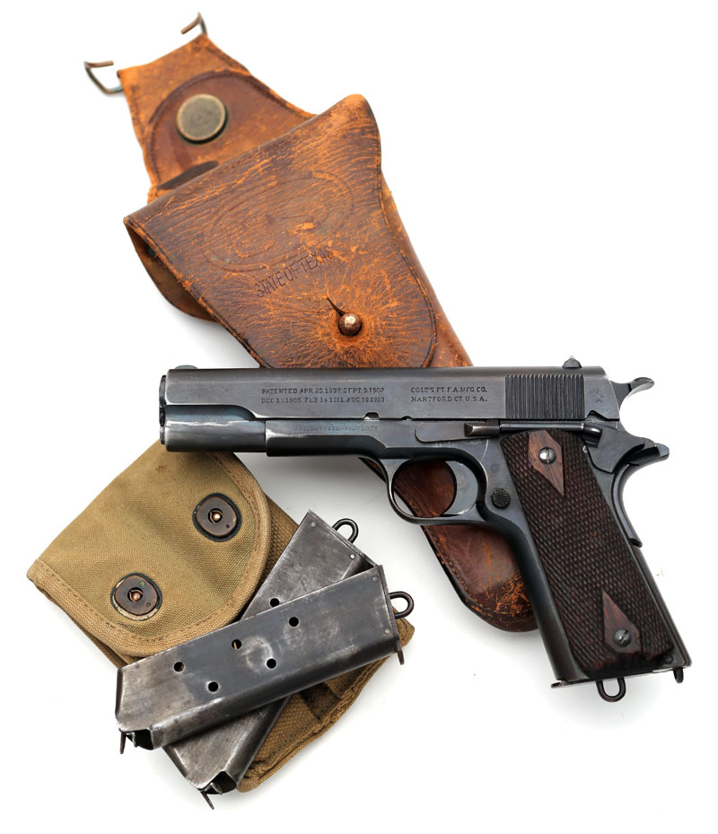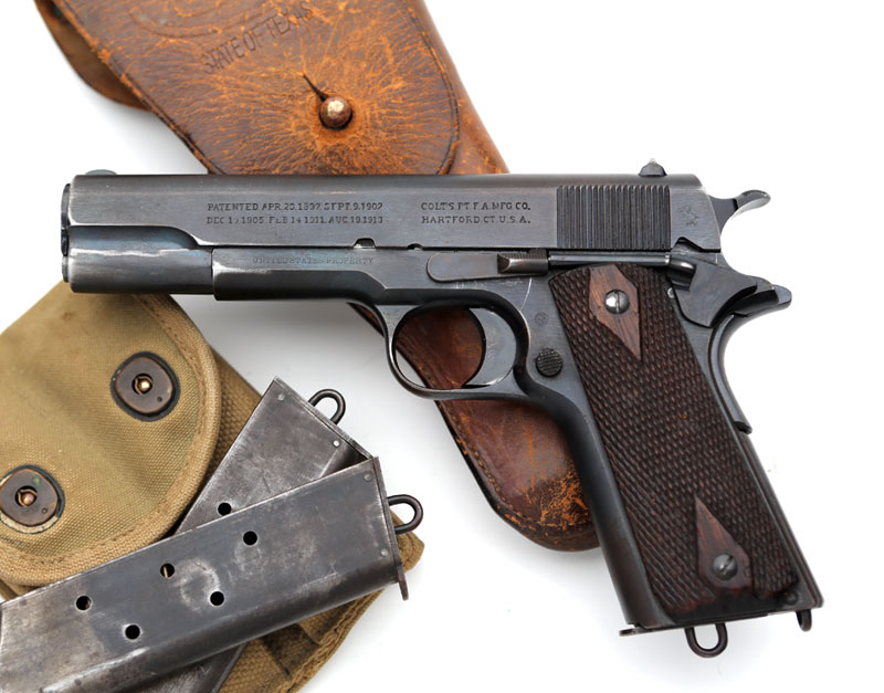 Colt Model of 1911 U.S. Army .45 ACP serial number 137309 (ca. 1916) - This Colt 1911 was one of 500 pistols (136901 - 137400) shipped to San Antonio Arsenal, San Antonio, Texas on December 16, 1916. Accompanying M1912 holster is marked "STATE OF TEXAS" on the flap and on the swivel. Also accompanying this pistol is a pair of Type I lanyard loop magazines.
