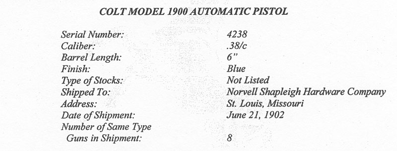 This Colt Model 1900 was shipped in a shipment of 8 pistols to Norvell Shapleigh Hardware Company, St. Louis, Missouri on June 21, 1902.