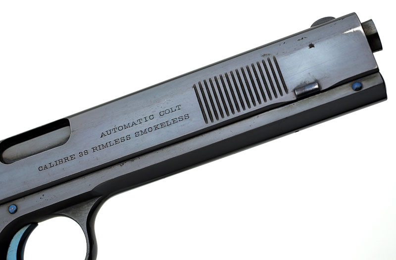 Colt Model 1900 serial number 4238 showing slide markings and color case hardened hammer with fire blue pins and screws.