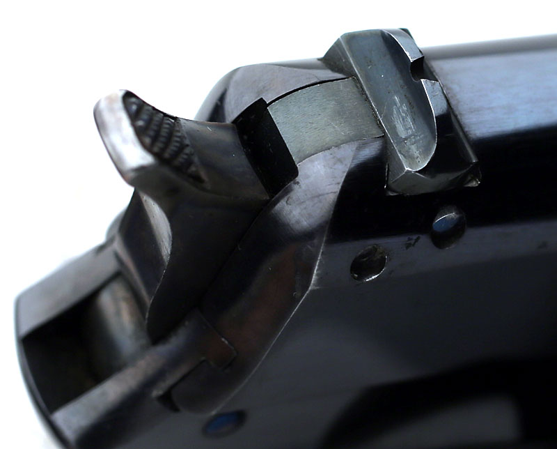 Factory Alteration to Sight Safety - sight safety has been removed and plugged with a piece of steel. A second pin was inserted in the rear of the slide to secure the block. Top of slide was modified with a dovetail to accept the new rear sight.