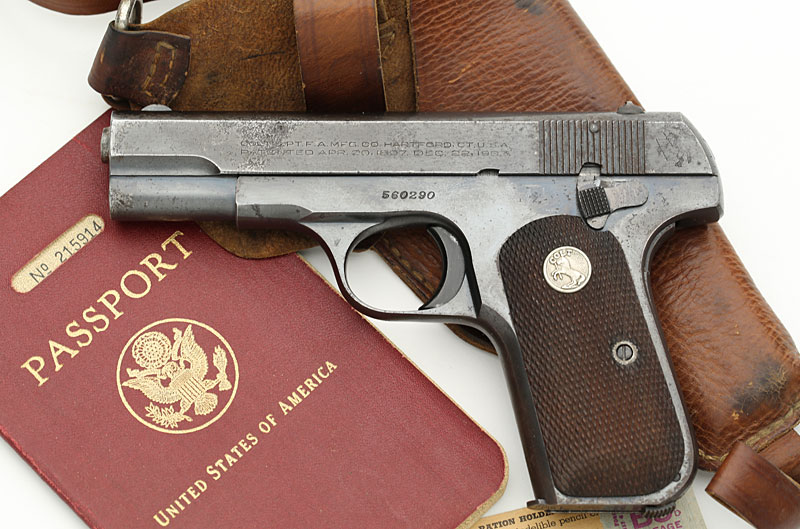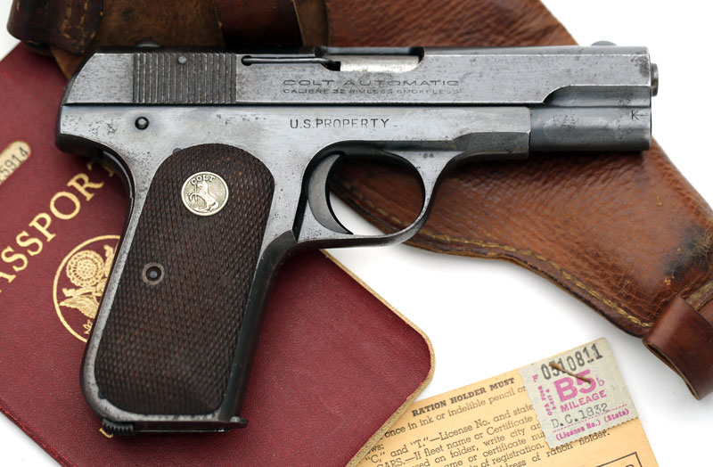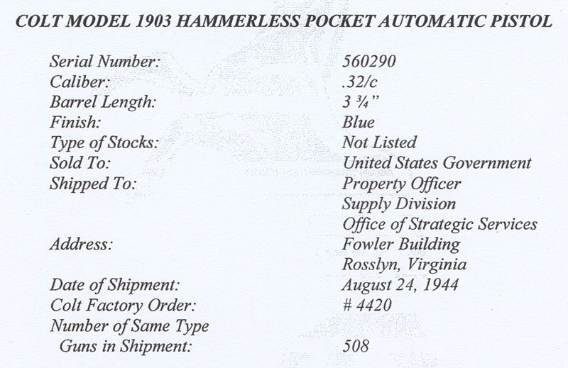 Colt 1903 Pocket Hammerless .32 ACP sn 560290 - issued by the OSS to Army Major Eric Lindgren Bark in Sweden during WWII. Included with this Colt is Major Lindgren Bark's passport and unmarked shoulder holster. Pistol was one of 508 sold to the United States Government and shipped on August 24, 1944 to the Property Officer, Supply Division, Office of Strategic Services, Fowler Building, Rosslyn, Virginia and processed on Colt Factory Order 4420.
