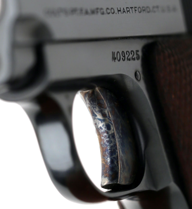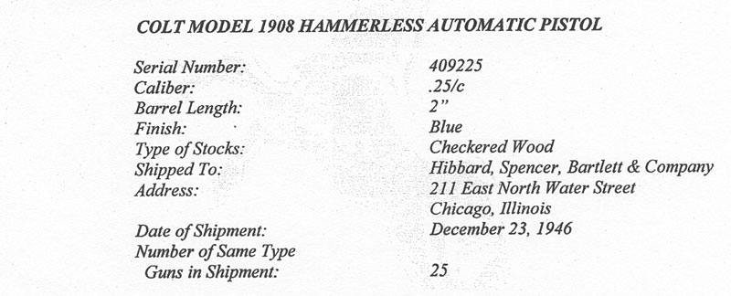 Colt Model 1908 Vest Pocket .25 ACP serial number 409225 (ca. 1946) - This Colt Vest Pocket was one of 25 pistols shipped with blue finish and checkered wood stocks to Hibbard, Spencer, Bartlett & Company on December 23, 1946. This what is known as a Pre/Post-War variation as it's assembled from pre-WWII parts, but shipped post-WWII.  These pre/post-war examples were tank blued and were shipped with either hard rubber or checkered walnut stocks.