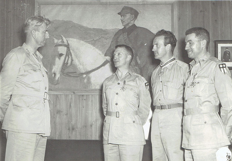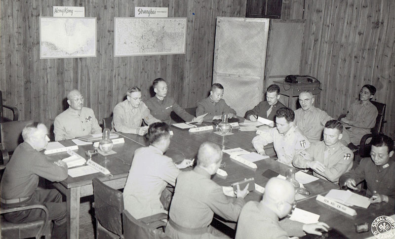 Generalissimo Chiang Kai-shek (seated under Hong Kong map), Col. Carl R. Dutton (seated third from the right) U.S. Army Signal Corp Photo (Photo courtesy of Randy Dutton, CDR, USNR-Retired) Carl was authorized to wear the following decorations and awards: Distinguished Service Medal, Legion of Merit, Bronze Star Medal, American Defense Service Medal, American Campaign Medal, Asiatic-Pacific Campaign Medal with three Bronze Service Stars, world War II Victory Medal, National Defense Service Medal, Chinese Order of Pao Ting, Collar (presented personally by Generalissimo Chiang Kai-shek), Chinese Order of Banner and Cloud, Collar Order of Yun Hui and Collar Order of Precious Tripod.