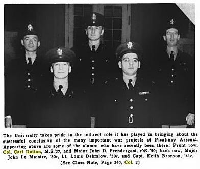 The University takes pride in the indirect role it has played in bringing about the successful conclusion of the many important war projects at Picatinny Arsenal. Appearing above are some of the alumni who have recently been there: Front row, Col Carl Dutton, M.S. '37 and Major John D. Prendergast '49-'50; back row, Major John Le Maintre, '30, Lt. Louis Dehmlow, '50, and Capt. Keith Bronson, '41.