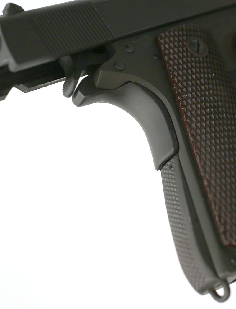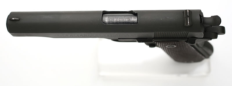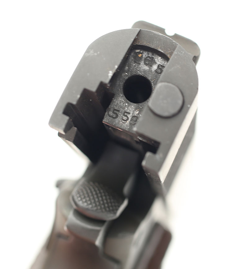This pistol was manufactured with the Swartz Safety (which was a firing pin block safety added to Government Model pistols around 1938) but the internals have been removed upon conversion to the military contract. This pistol also has the letter S (the commercial sale mark) stamped inside the slide and frame. These pistols have commercial magazines which were also transferred to the military contract. They are full blued, with riveted bases and are marked COLT over .45 AUTO. The bottoms of these commercial magazines have been sandblasted to make them non-reflective. There is a P proof on the top of the slide, in front of the rear sight and alto a P on the left side of the frame near the magazine release button. The barrel in this gun is a commercial barrel marked COLT .45 AUTO on the left side, with the commercial sale mark S in front of the barrel lug on the underside of the chamber. There is no P on the left lug. Gun has Type 2 Coltwood plastic grips with strengthening ribs, mold numbers and large reinforcing rings around screw holes.