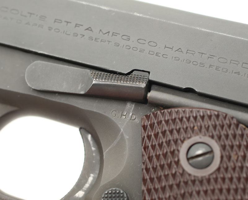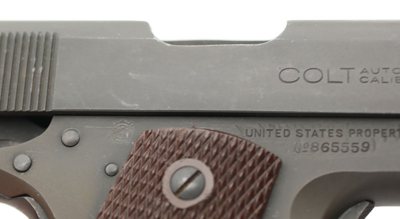 Colt Model 1911A1 .45 ACP Serial Number 865559 (Left Side) - "G.H.D." inspected and "P" proofed on left side of the frame. ![]() Commercial slide marking on right side of slide.
