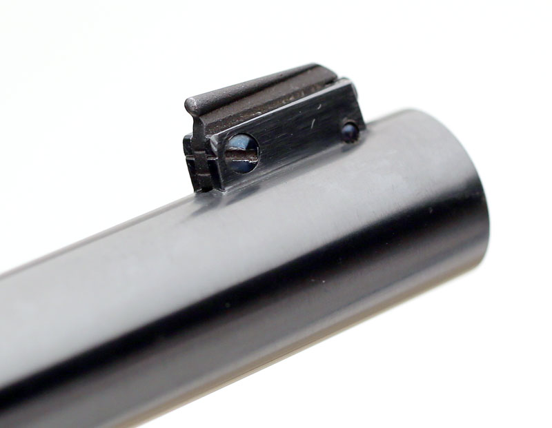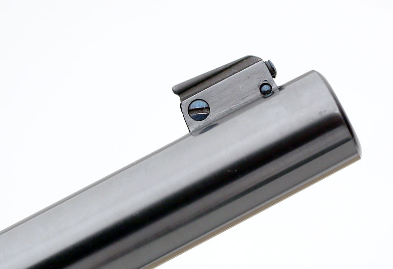 Colt Woodsman Target Pistol .22 LR Serial Number 55070 - Close-up of adjustable front sight with fire blue retaining screws.