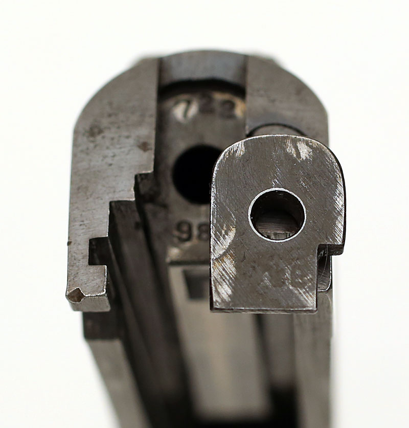 Colt Model 1911A1 .45 ACP serial number 722980 (ca. 1941) - showing ghost image of slide serial number on back of the firing pin stop .