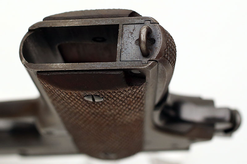 Colt Model 1911A1 .45 ACP serial number 722980 (ca. 1941) - Magazine well and base showing lanyard loop of checkered arched mainspring housing. |