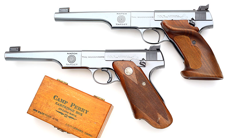 Colt Woodsman Bullseye Match Target .22 LR serial number MT3894 (bottom) pictured with MT7971 fitted with target grips (top).