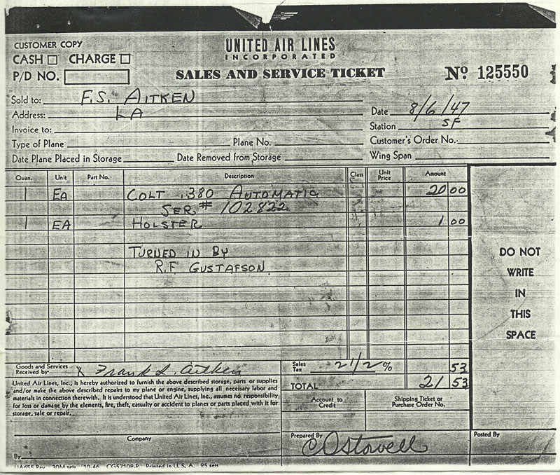 Colt 1908 Pocket Hammerless .380 ACP sn 102822 - service ticket showing the pistol was turned in by R.F. Gustafson and purchased by F.S. Aitken on August 6, 1947.