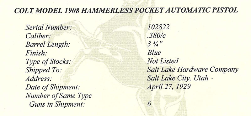 Colt 1903 Pocket Hammerless .380 ACP sn 102822 - a standard production Colt Pocket Hammerless .380 ACP with PROPERTY OF U.A.L. inscription added to the right side of the frame. The factory letter for this pistols indicates that it was one of 6 shipped to Salt Lake Hardware Company, Salt Lake City, Utah on April 27, 1929, presumably where it was purchased by United Air Lines and property marked for their use.