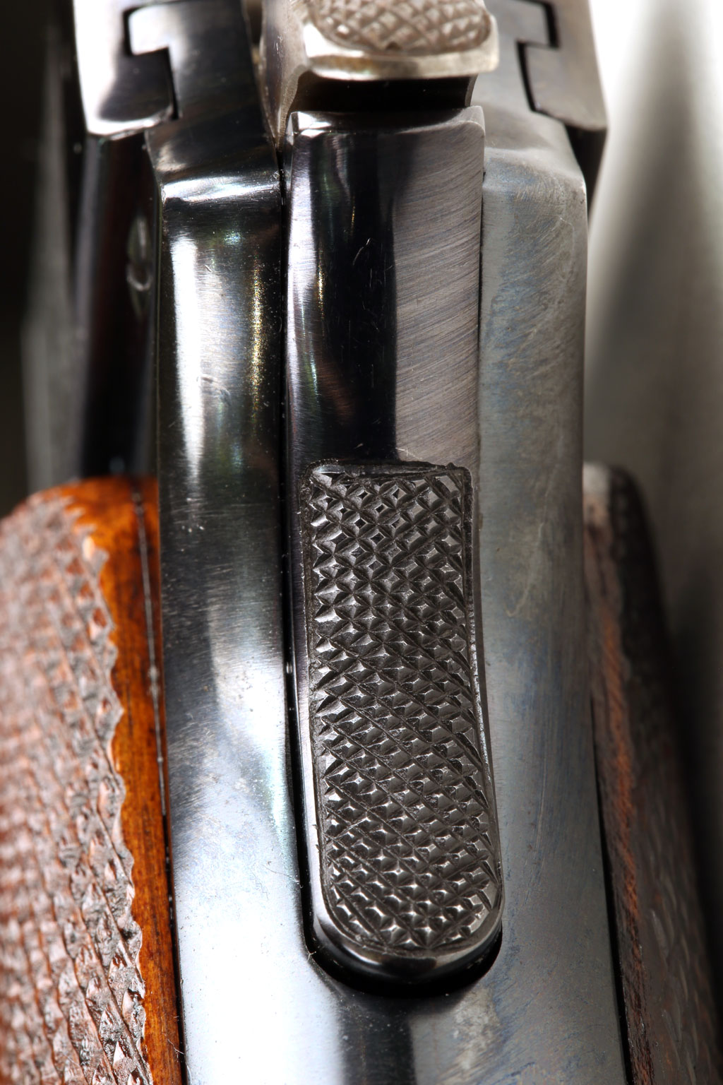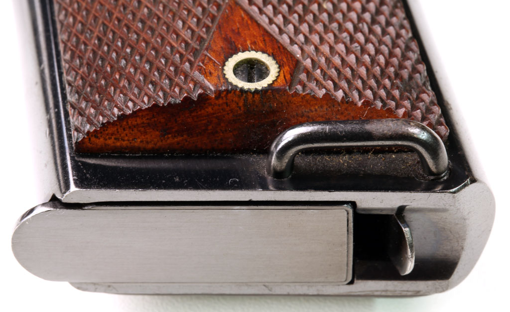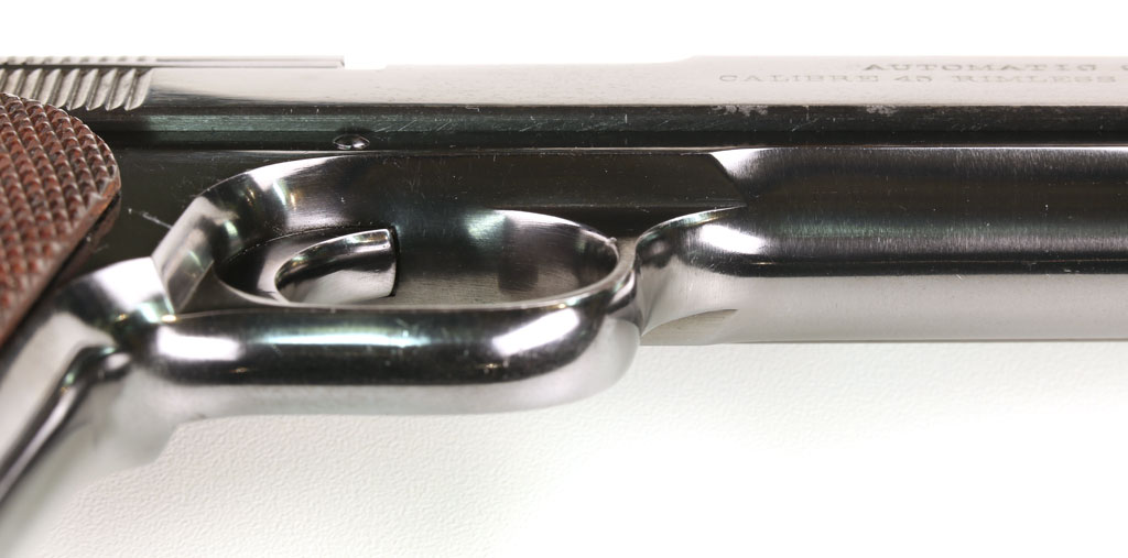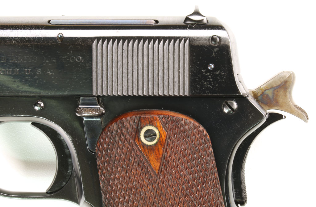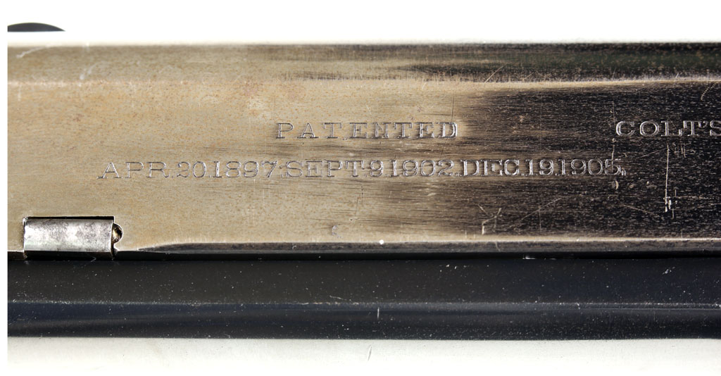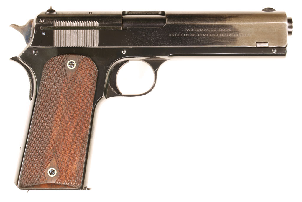 Model 1907 Military Serial Number 19 - 200 .45 cal. No. 1 -200 (inclusive) Modified hammer, Nearly vertical ejection. Auto Indicator to show that chamber is loaded, Auto safety, Strengthened stirrup, and Lengthened trigger stirrup pin. Shipped to the U.S. Government, Springfield Armory, March 17, 1908