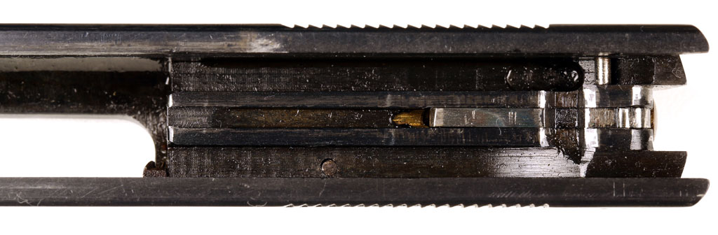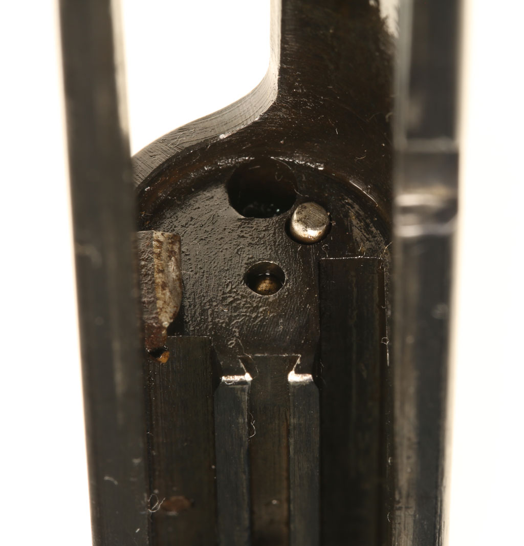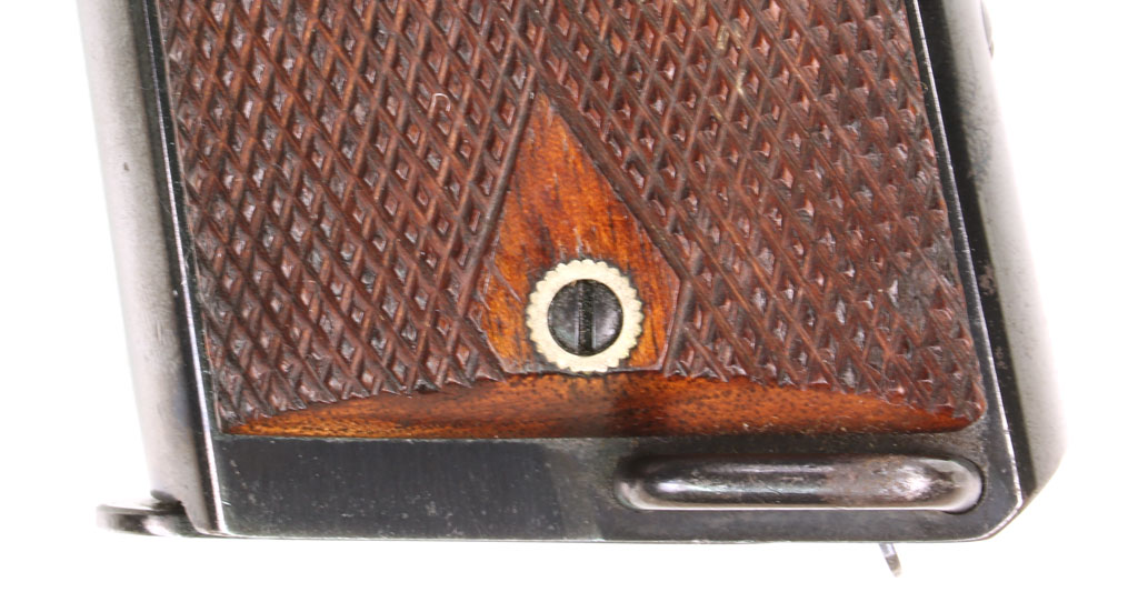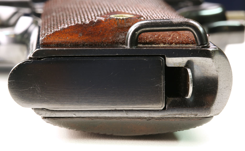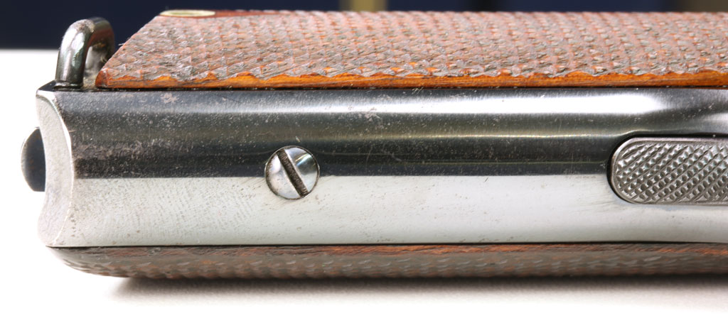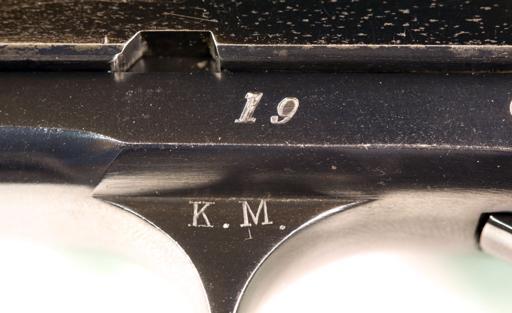 Left side of Model 1907 sn 19.  Note the grip safety and lanyard loop.  A single officer presided over the inspection of the Model 1907 Contract pistols.   All of the pistols bear the initials "K.M." for Major Kenneth Morton.  These initials are hand stamped into the upper leg of the trigger guard on the left side.  Major Morton assumed the post in April 1907 and acted as the inspecting and accepting officer throughout the fiscal year 1907 - 1908.